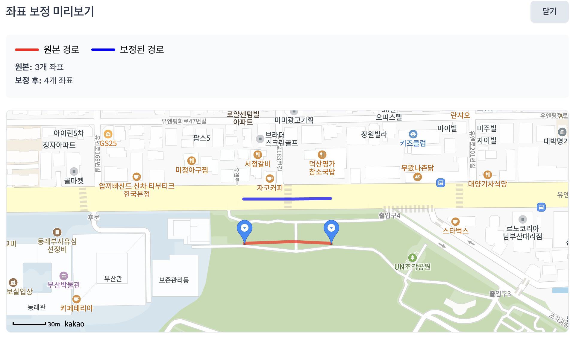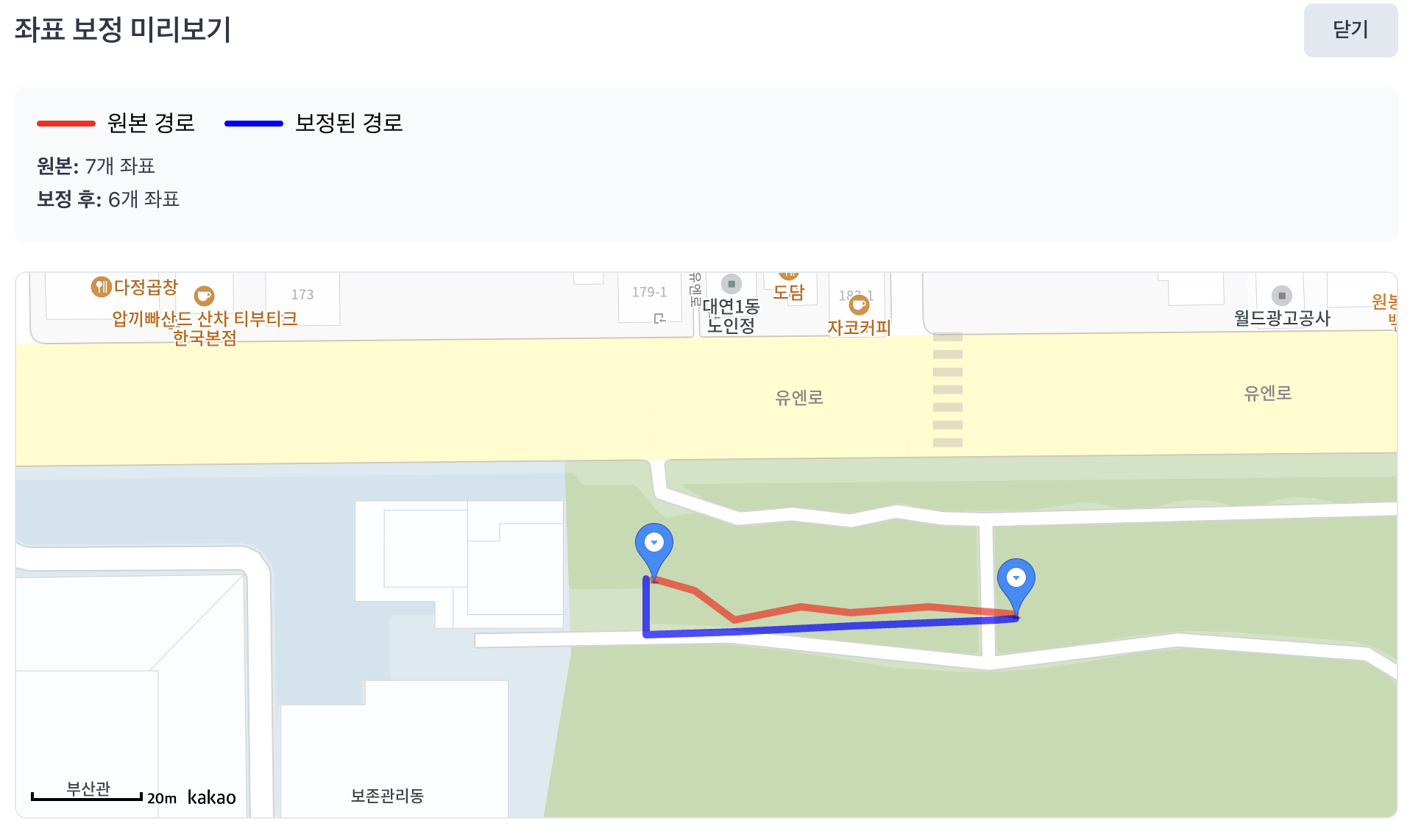 ์ด ๋ฐฉ๋ฒ์ ํตํด ๊ธฐ์กด kml ํ์ผ๋ณด๋ค ํ์ง์ด ์ข์ ๋ฌ๋ ์ฝ์ค ๋ฐ์ดํฐ๋ฅผ ์์งํ ์ ์์๋ค. ํ์ง๋ง ํด๋น ๋ฐฉ์์ ์ธก์ ํ๋ ์ฌ๋์ ๊ธฐ๊ธฐ์ ๋ฐ๋ผ ์ธก์ ์ฑ๋ฅ์ด ์ฐจ์ด๋๋ ์น๋ช