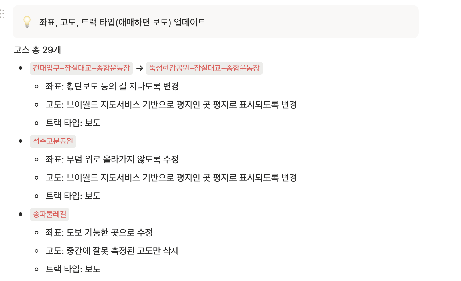 ๊ทธ๋์ ๋ค๋ฅธ ๋ฐฉ๋ฒ์ ์ฐพ์๊ณ , ์ด๋ ๋ค๋ฅธ ์ธ๋ถ ์๋น์ค (์คํธ๋ผ๋ฐ, ๊ฐ๋ฏผ ๋ฑ)์ ์ด์ฉํ๊ฑฐ๋ ๋ธ๋ก๊ทธ, ์ธ๋ถ ์ปค๋ฎค๋ํฐ๋ฅผ ์ฐพ์ผ๋ฉฐ ์ค์ ๋ฌ๋์ ๋ด ์ฌ๋๋ค์ ๊ธฐ๋ก์ gpx ํ์ผ๋ก ์ถ์ถํ์ฌ ์ฝ์